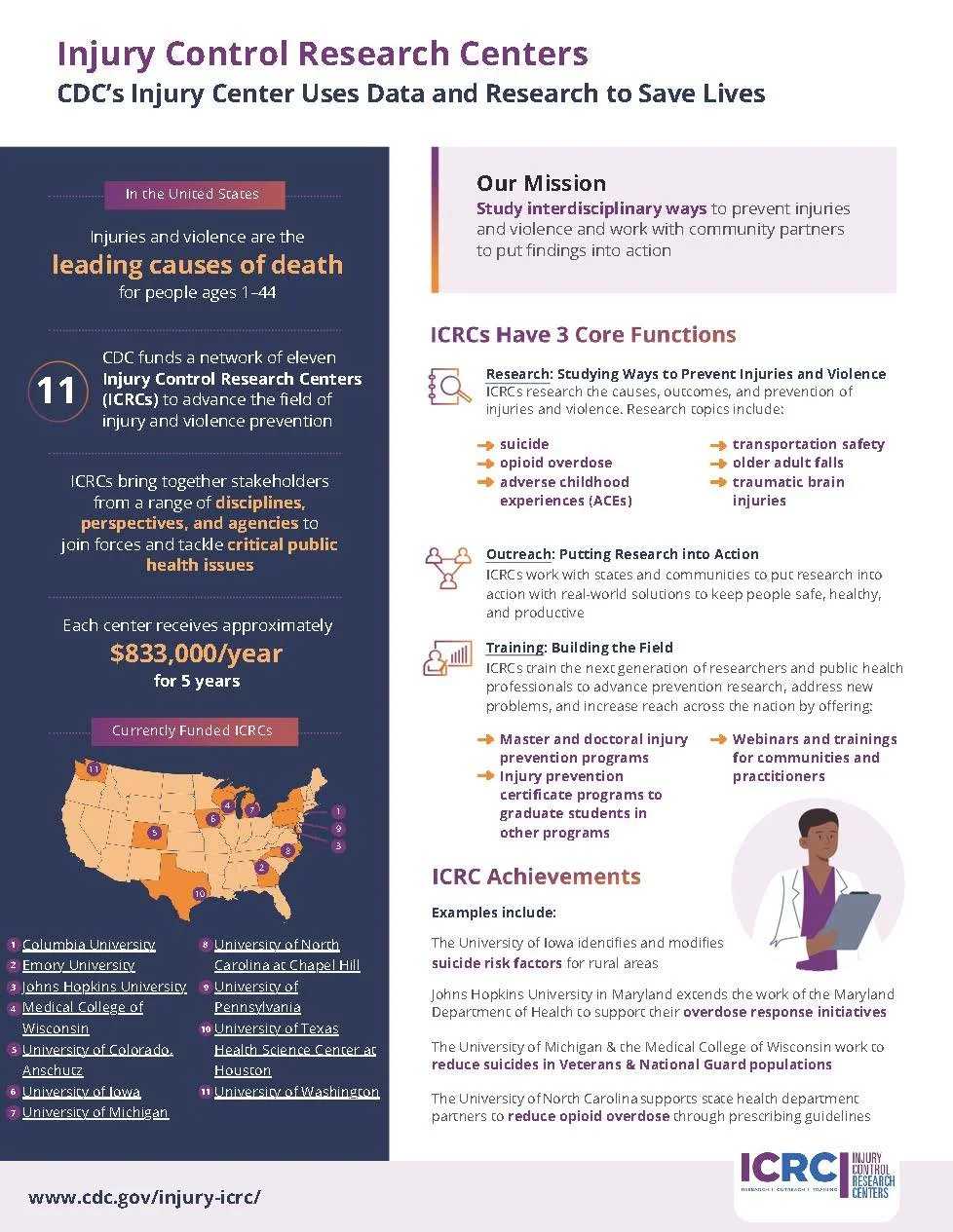 The CDC’s Injury Control Research Center (ICRC) program began in 1987 and has grown considerably since its inception. In 1987, four centers were awarded approximately $500,000 per center each year for five years. By 2019, the program grew to include nine centers who were awarded approximately $833,000 per center each year for five years. Typically, ICRCs are funded for five-year cycles through an externally reviewed, competitive process.